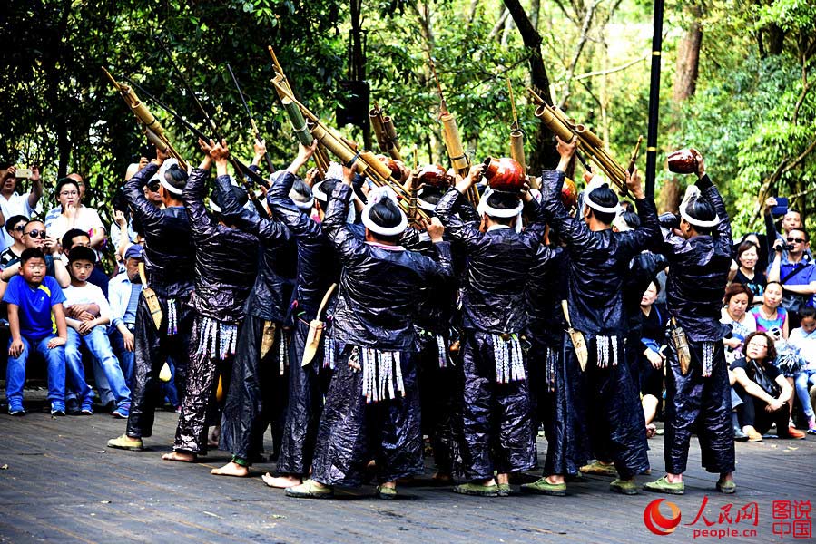 Located in mountain area south of Congjiang county, southwest China’s Guizhou province, Basha Miao village is a remote village that still maintains simple and unsophisticated folkway. With the special approval of the Ministry of Public Security, villagers here can possess guns. With the opening of the expressway and high speed rail that connect Congjiang with other cities, more and more tourists have come to visit this pristine village and watch their traditional dance. (Photo source: people.cn)