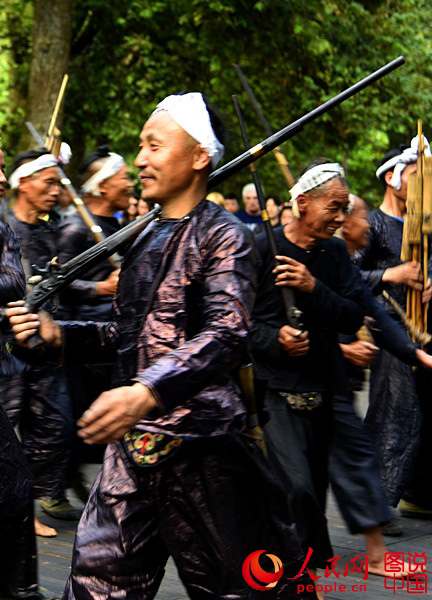 | Located in mountain area south of Congjiang county, southwest China’s Guizhou province, Basha Miao village is a remote village that still maintains simple and unsophisticated folkway. With the special approval of the Ministry of Public Security, villagers here can possess guns. With the opening of the expressway and high speed rail that connect Congjiang with other cities, more and more tourists have come to visit this pristine village and watch their traditional dance. (Photo source: people.cn) |