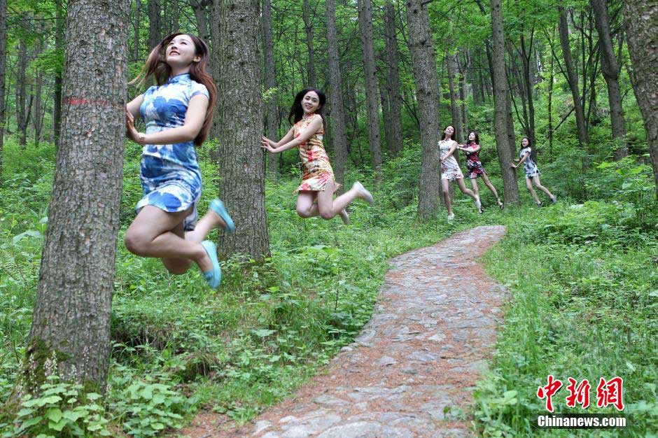 Five college girls in cheongsam pose for a "floating photo" in Luoyang Longyuwan National Forest Park, central China's Henan province, May 21, 2015. The girls wanted to promote harmony between human beings and nature. They believed that nature is the most beautiful stage. (CNS/Wang Zhongju)