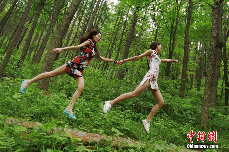Two college girls in cheongsam pose for a "floating photo" in Luoyang Longyuwan National Forest Park, central China's Henan Province, May 21, 2015. The girls wanted to promote harmony between human beings and nature. They believed that nature is the most beautiful stage. (CNS/Wang Zhongju)