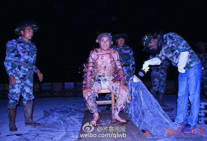 Gao Bingguo is covered with bees during an attempt to break the Guinness World Record for being covered by the largest number of bees in Taian city, East China’s Shandong province, May 25, 2015. Despite bee stings, Gao set a new record for having 109.05 kg of bees on his body at one time. (Photo/Weibo of Qilu Evening News)
