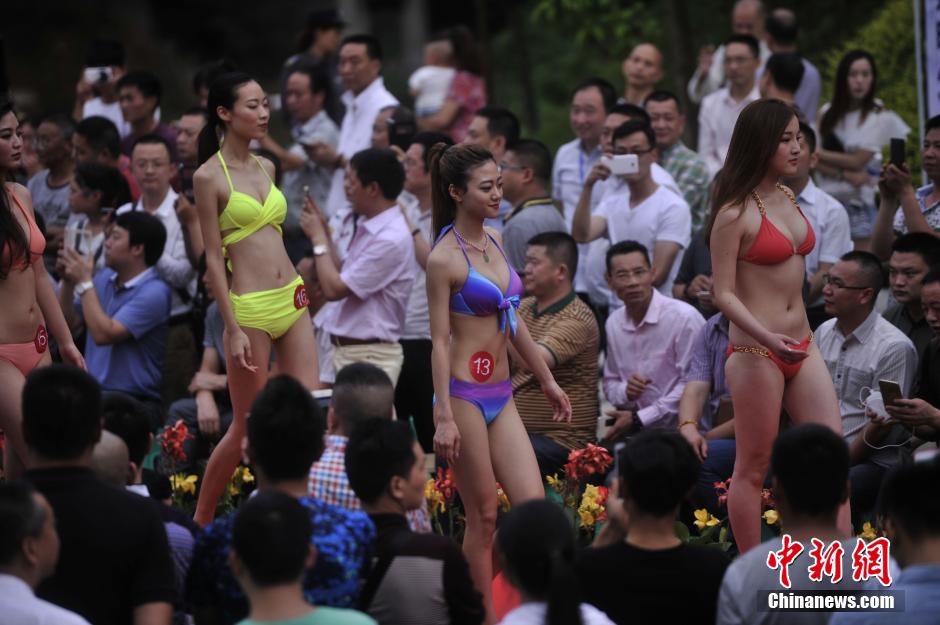 | Charming contestants attend the swimsuit competition in a model contest in southwest China’s Chongqing on May 24, 2015. (Chinanews/Chen Chao) |