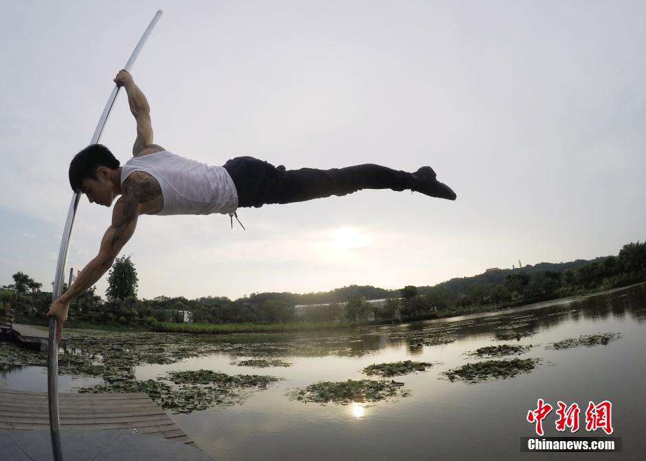 | Wu Xin, who represented China to attend the pole dancing world championship early this year, is an outstanding male pole dancer. Male pole dancers are scarce in China since they are still misunderstood by some people. However, Wu Xin, as the chief couch of a famous pole dancing school, has decided to train more male pole dancers for athletic pole dancing. (Chinanews/Wang Xi) |
