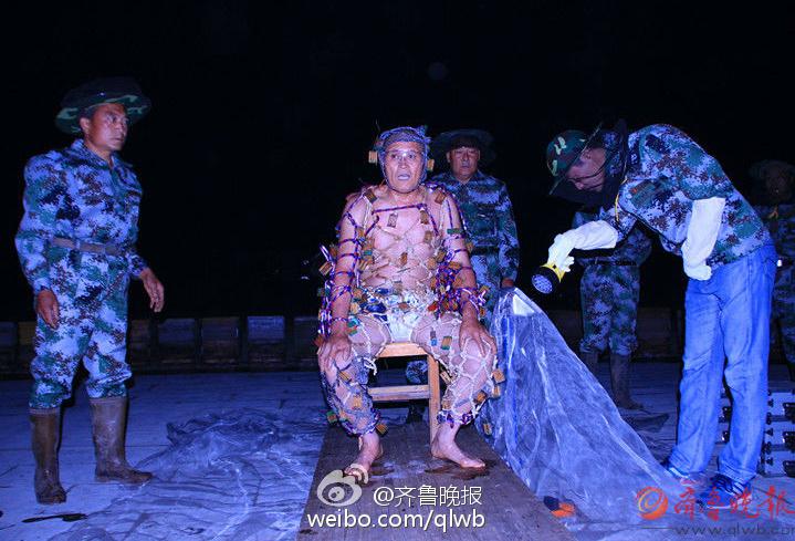 Gao Bingguo, a man from east China’s Shandong province, successfully sets a new Guinness record by covering his body in bees on May 25, 2015. Over a million bees covered his body like a bee garment. Gao got stung all over the body. (Photo source: Weibo of Qilu Evening News)