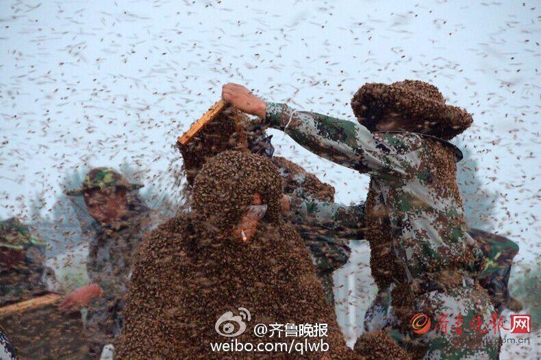Gao Bingguo, a man from east China’s Shandong province, successfully sets a new Guinness record by covering his body in bees on May 25, 2015. Over a million bees covered his body like a bee garment. Gao got stung all over the body. (Photo source: Weibo of Qilu Evening News)