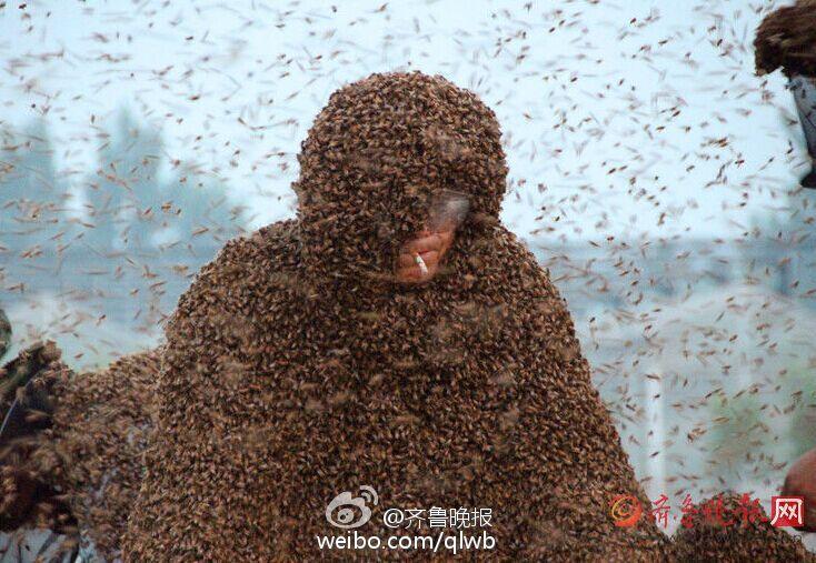 | Gao Bingguo, a man from east China’s Shandong province, successfully sets a new Guinness record by covering his body in bees on May 25, 2015. Over a million bees covered his body like a bee garment. Gao got stung all over the body. (Photo source: Weibo of Qilu Evening News) |