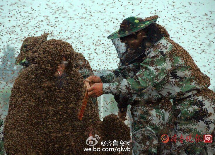 Gao Bingguo, a man from east China’s Shandong province, successfully sets a new Guinness record by covering his body in bees on May 25, 2015. Over a million bees covered his body like a bee garment. Gao got stung all over the body. (Photo source: Weibo of Qilu Evening News)