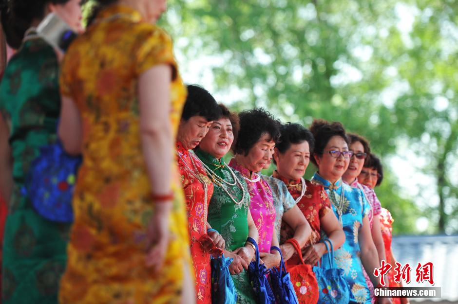 A group of 'damas' stage a cheongsam show in Xinbin Man Autonomous County, northeast China's Liaoning Province on May 25, 2015. Nearly 200 people showed cheongsams of different times at the first Hetu Ala Cheongsam Cultural Festival. It is said that Xinbin is the birthplace of the Qing Dynasty. Cheongsam has a deep historical root in this place. (CNS/Sun Haosheng)