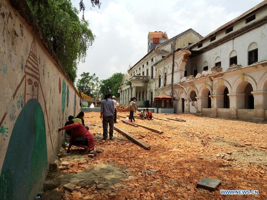 Volunteers make marks for temporary makeshift tents in front of the severely damaged Durbar High School in Kathmandu, capital of Nepal, on May 28, 2015. Schools are yet not ready to resume classes with proper preparations though the government declared to open schools in earthquake affected districts from May 31. (Xinhua/Sunil Sharma)