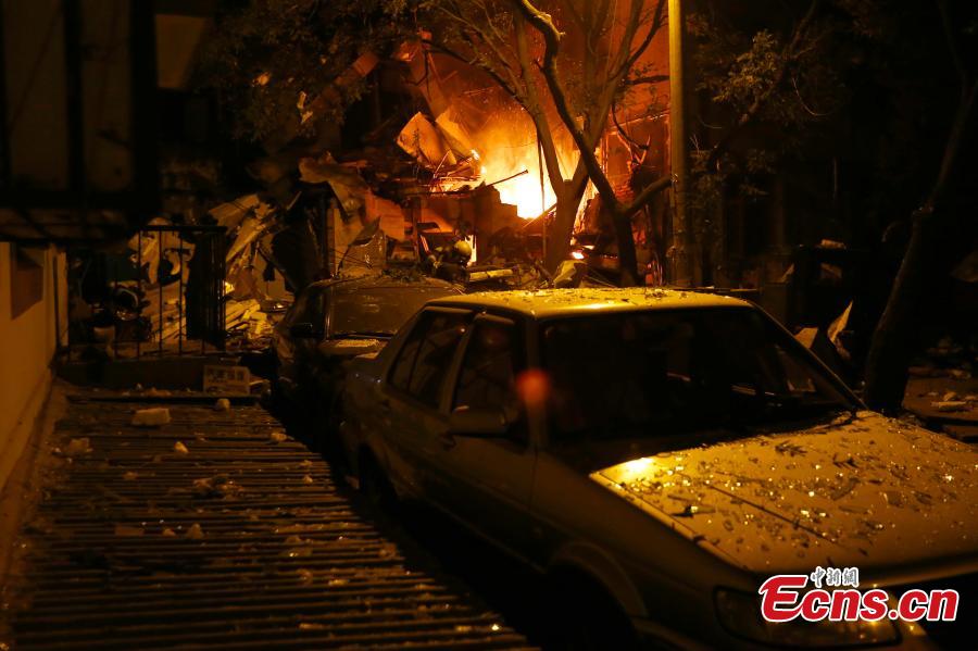 Firefighters put out a fire at a restaurant in Fengtai district, Beijing, May 28, 2015. Houses and cars near the restaurant were also damaged and the cause of the fire is still under investigation.(Photo: China News Service/Fu Tian)