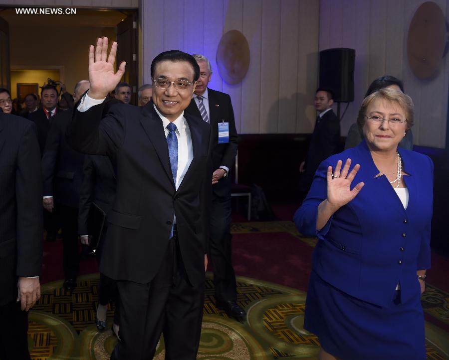 | Chinese Premier Li Keqiang (L) and Chilean President Michelle Bachelet wave at the opening of an economic and trade seminar marking the 45th anniversary of the establishment of China-Chile diplomatic relations and the seventh meeting of the China-Chile Business Council in Santiago, capital of Chile, May 26, 2015. (Xinhua/Zhang Duo) |
