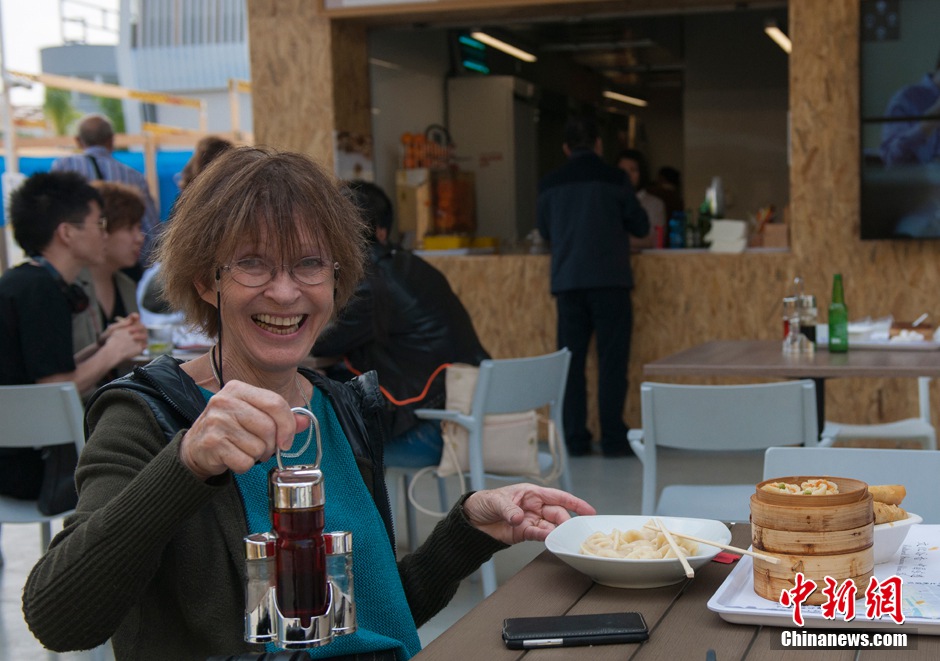 China Pavilion in the shape of golden billowing wheat field at Expo Milan 2015 attracted a lot of attention, May 26, 2015. Besides all the Chinese elements in the pavilion, Chinese restaurants are especially popular among foreign tourists. Dumplings and stir-fried rice noodles are their favorites.