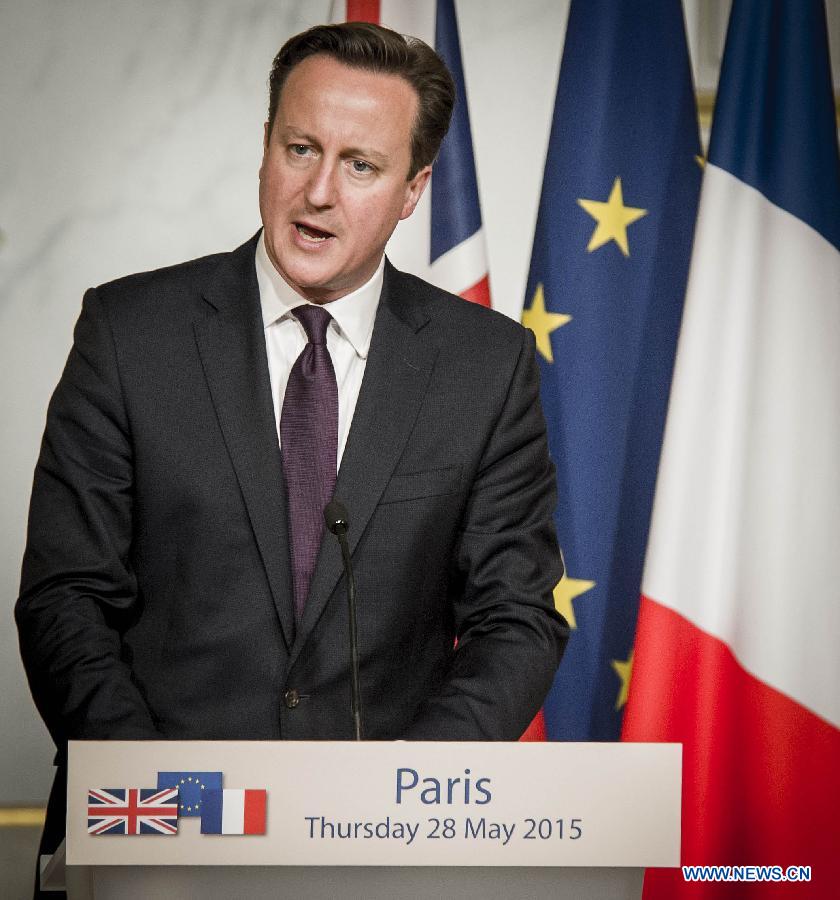 British Prime Minister David Cameron attends a press conference in Paris, France, on May 28, 2015. French President Francois Hollande on Thursday received British Prime Minister David Cameron who started a European tour to build support for EU reforms before EU membership in-out referendum by the end of 2017. (Xinhua/Chen Xiaowei)