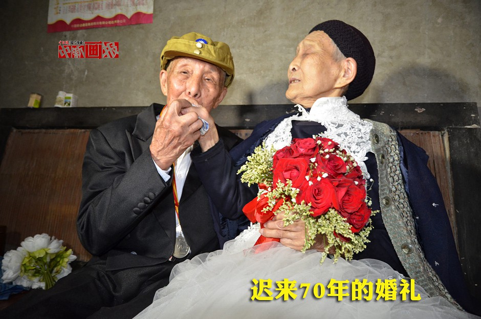 70 years ago, they got married without a wedding; 70 years later, she donned the wedding gown and they exchanged their wedding rings. In Jinhua Village, Dazhou City of Sichuan Province, 94-year-old Yan Zhengming planned a wedding ceremony for his 90-year-old wife Zhou Suqing, on May 15, 2015.