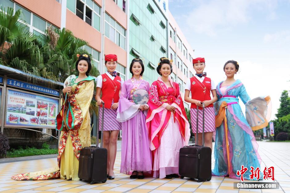 Upon graduation, eight students from Chengdu East Star Airlines Travel College take creative photos to celebrate their colorful university life. These students have been recruited as flight attendants.(Photo/Chinanews.com)