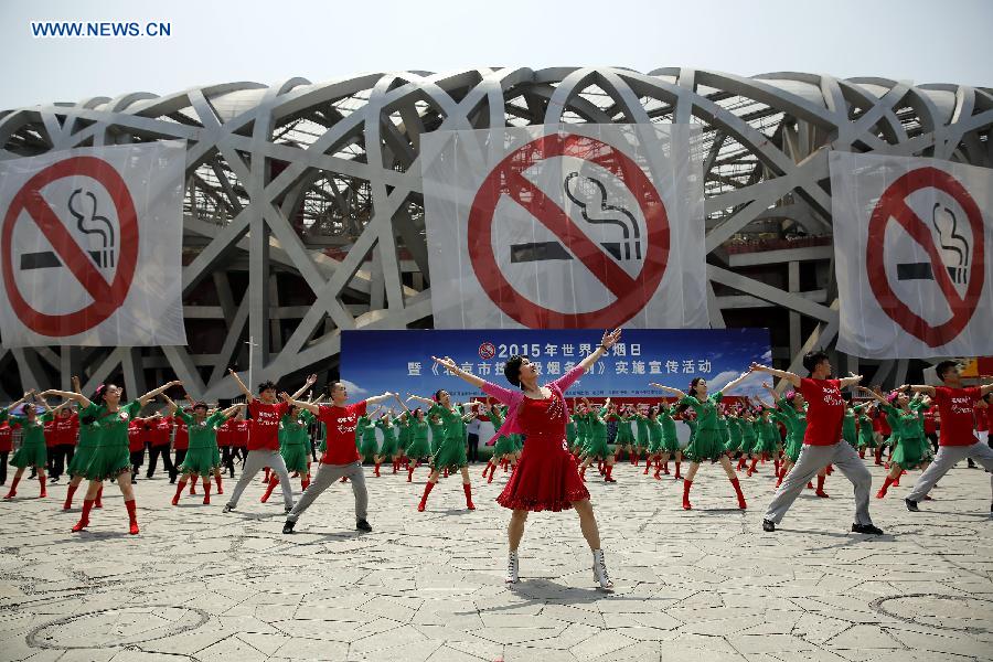 Dancers perform in front of anti-smoking banners displayed on the iconic Bird's Nest National Stadium on World No Tobacco Day in Beijing, May 31, 2015. (Xinhua/Shen Bohan)
