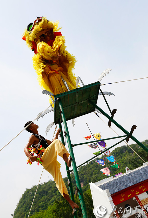 The lion dance of Zhuang people in Tianyang county, south China’s Guangxi is famous for its high difficulty. The stunts often performed in Tianyang lion dance include knifepoint dance, quincuncial piles dance and bridge dance. Tianyang lion dance was identified as a national level intangible cultural heritage in 2009. (Photo source: people.cn)