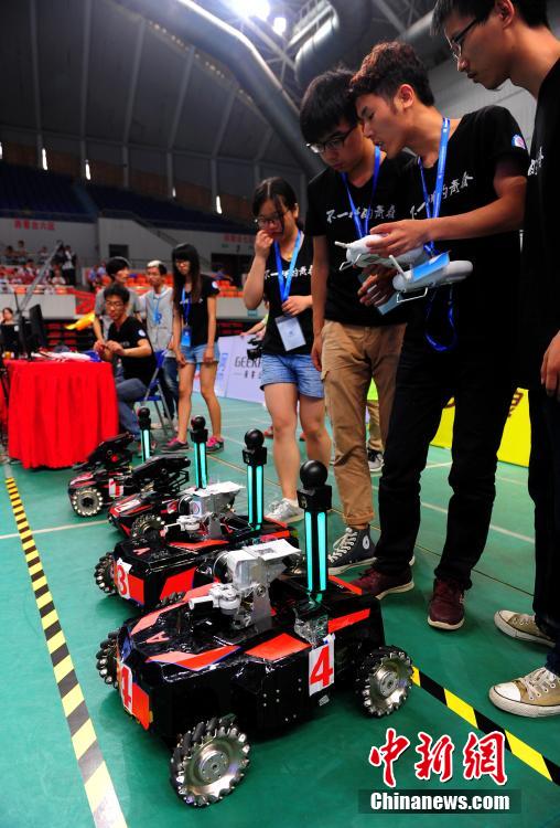 The final of central and south competition areas of 2015 China Robot Competition “RoBoMasters” was held in Huazhong University of Science and Technology in Wuhan, central China’s Hubei province on May 31, 2015. 22 teams from 17 universities attended the game. All the attending robots are developed independently. The 32 winners from different competition areas will take part in the national final in July in Shenzhen. (Chinanews/Zhang Chang)