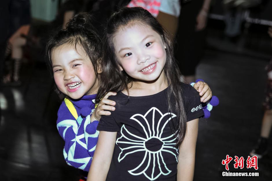 Two children pose for a photo behind the T-stage after the show. The awarding ceremony of the Third China (Zhili) National Children's Wear Contest was held in Huzhou City, east China's Zhejiang Province, May 31, 2015. Zhili Town, located in the Wuxing District of Huzhou City, is famous for its children's wear industry. (CNS/Xiong Ran)