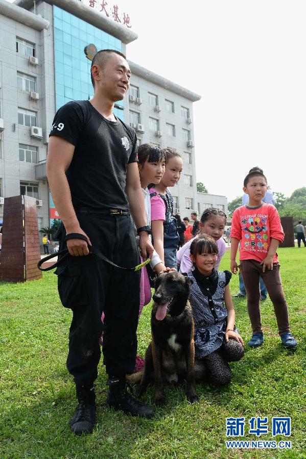 Children take group photos with trainers and their dogs on May 17, 2015. (Xinhua/Qiao Qiming)