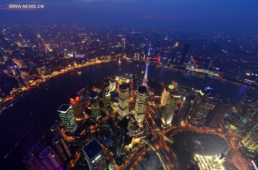 Photo taken from Shanghai Tower on April 27, 2015 shows a view of downtown Shanghai, east China. Shanghai Tower, a megamall skyscraper under construction, stands approximately 632 meters high and has 128 stories, with a total floor area of 380,000 square meters. It's projected to open to the public in mid-2015. (Xinhua/Huang Weiguo)