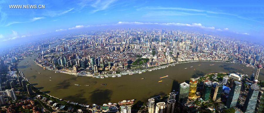 Photo taken from Shanghai Tower on July 22, 2014 shows a view of downtown Shanghai, east China. Shanghai Tower, a megamall skyscraper under construction, stands approximately 632 meters high and has 128 stories, with a total floor area of 380,000 square meters. It's projected to open to the public in mid-2015. (Xinhua/Huang Weiguo)