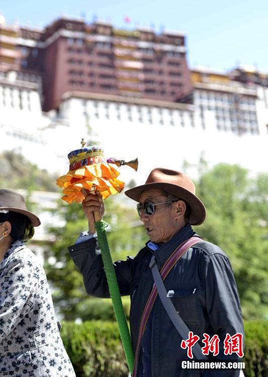 | Large number of Buddhists come to Tibet during Tibetan traditional Festival “Saga Dawa” in April of the Tibetan calendar. Most of them walked along three roads in Lhasa while turning the prayer wheels. The festival commemorates the birth, enlightenment, and death of Gautama Buddha. (Chinanews.com/Li Lin) |