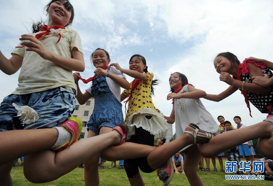 Pupils play "basket knitting" game at a PE class in a primary school in Shangyu, east China's Zhejiang province, Sept. 1, 2012. (Xinhua/Han Jian)