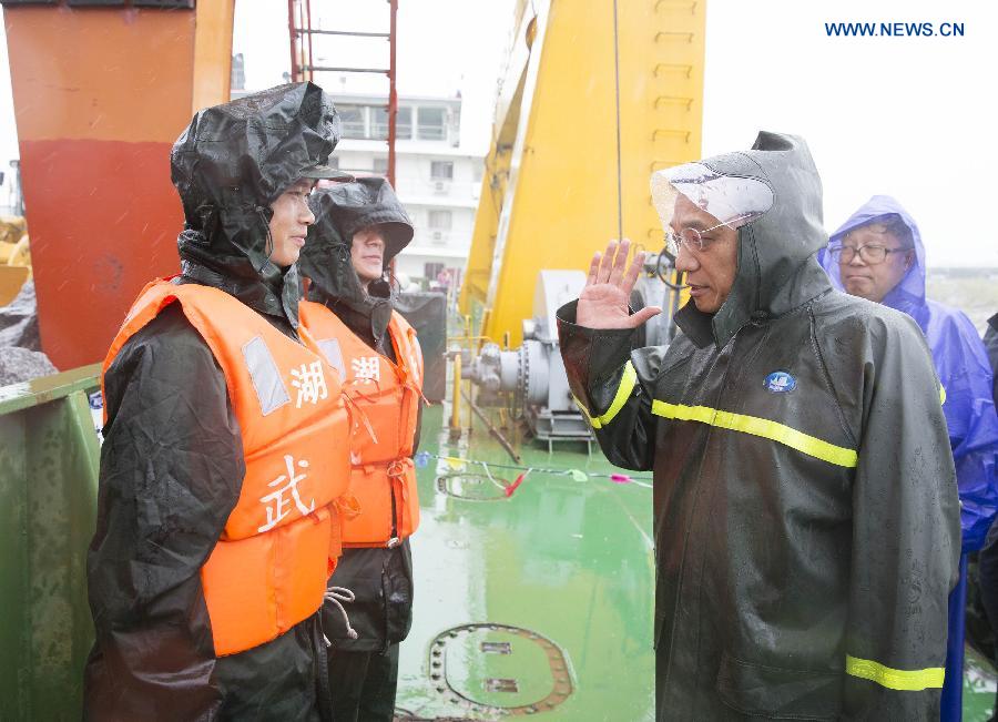 Chinese Premier Li Keqiang (R Front) visits rescuers at the site of overturned ship in the Jianli section of the Yangtze River in central China's Hubei Province, June 3, 2015. The ship, named Dongfangzhixing, or Eastern Star, sank on Monday in the Jianli section of the Yangtze River. As of Tuesday night, 14 people had been rescued, with seven others confirmed dead and about 430 missing. (Xinhua/Huang Jingwen)