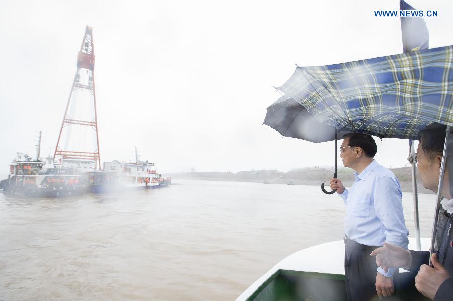 Chinese Premier Li Keqiang (L) gives instructions on search and rescue work on a ship at the site of overturned ship in the Jianli section of the Yangtze River in central China's Hubei Province, June 3, 2015. The ship, named Dongfangzhixing, or Eastern Star, sank on Monday in the Jianli section of the Yangtze River. As of Tuesday night, 14 people had been rescued, with seven others confirmed dead and about 430 missing. (Xinhua/Huang Jingwen)
