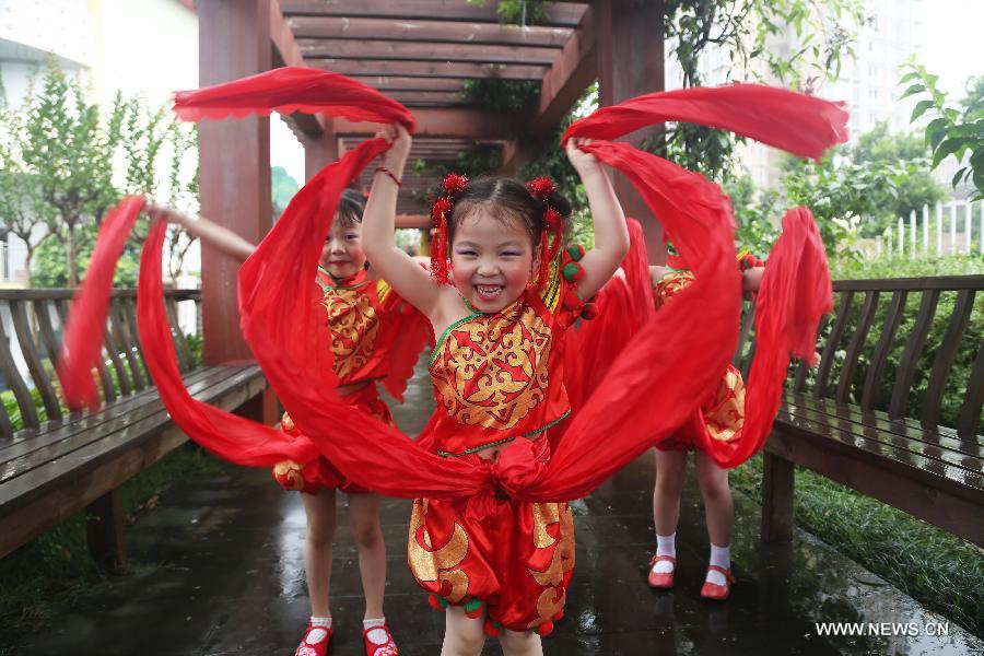 Children of Kindergarten affiliated to Chaoyang Elementary School pose for a graduation photo in Chongqing, southwest China, June 2, 2015. As the graduation season comes, graduates are busy with taking creative graduation photos at campuses. (Xinhua/Qin Tingfu)
