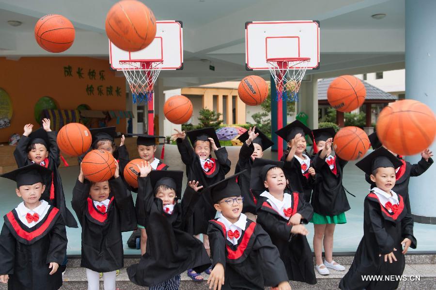 Children of Experimental Kindergarten of Jingning She Autonomous County pose for a graduation photo in Lishui, east China's Zhejiang Province, June 3, 2015. As the graduation season comes, graduates are busy with taking creative graduation photos at campuses. (Xinhua/Li Suren)