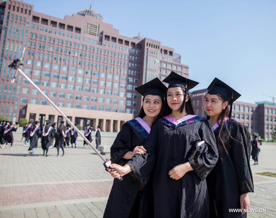 Graduates of the School of Art at Inner Mongolia University pose for a selfie graduation photo in Hohhot, capital of north China's Inner Mongolia Autonomous Region, May 7, 2015. As the graduation season comes, graduates are busy with taking creative graduation photos at campuses. (Xinhua/Ding Genhou)