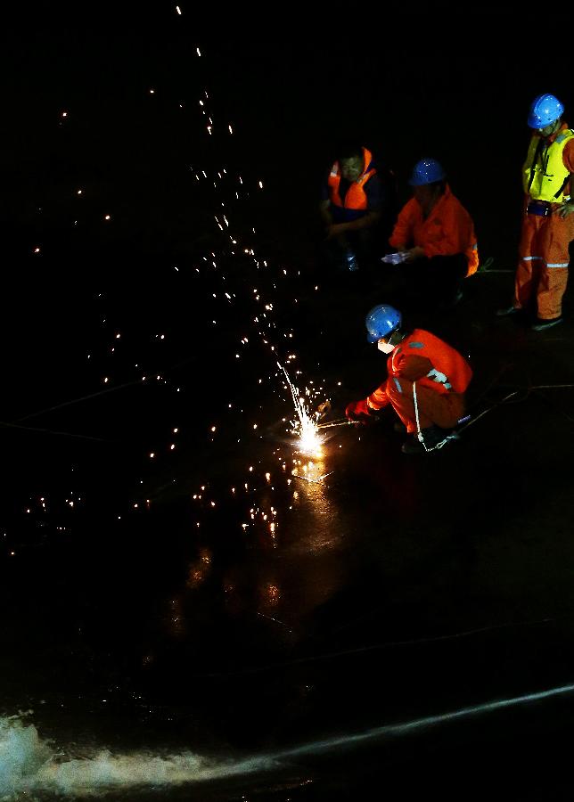 Rescue workers are cutting into the hull of the cruise ship Eastern Star that capsized late on Monday in the Jianli section of the Yangtze River in central China's Hubei Province, June 3, 2015. Rescuers have only found 14 survivors, and so far have retrieved 26 bodies, leaving over 400 people still unaccounted for. (Xinhua/Xiao Yijiu)