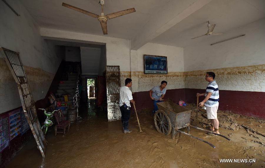 | Residents clear the mud at home in Linxiang city, central China's Hunan Province, June 3, 2015. Torrential downpours have been sweeping through south China since the beginning of June. According to Hunan provincial civil affairs department, the rainstorms have killed five people and affected more than 1,157,000. (Xinhua/Li Ga) |