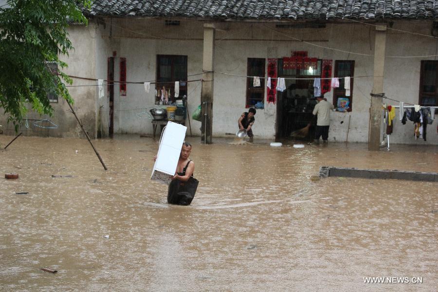 A man transfers goods in a flooded village in Wannian County of Shangrao, east China's Jiangxi Province, June 3, 2015. Torrential downpours swept through provinces Jiangxi and Guizhou on Wednesday. (Xinhua/Chen Fenghua)