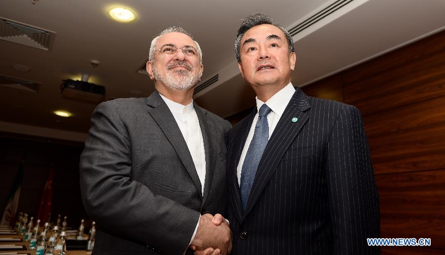 Chinese Foreign Minister Wang Yi (R) shakes hands with his Iranian counterpart Mohammad Javad Zarif as they meet in Moscow, capital of Russia, June 4, 2015. (Xinhua/Jia Yuchen)