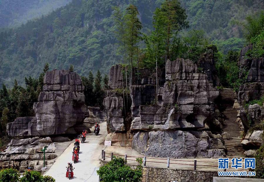 A group of motorcyclists ride in a bamboo and stone forest scenic area in Changning county, southwest China's Sichuan province, April 27, 2014. (Xinhua/Wang Song)