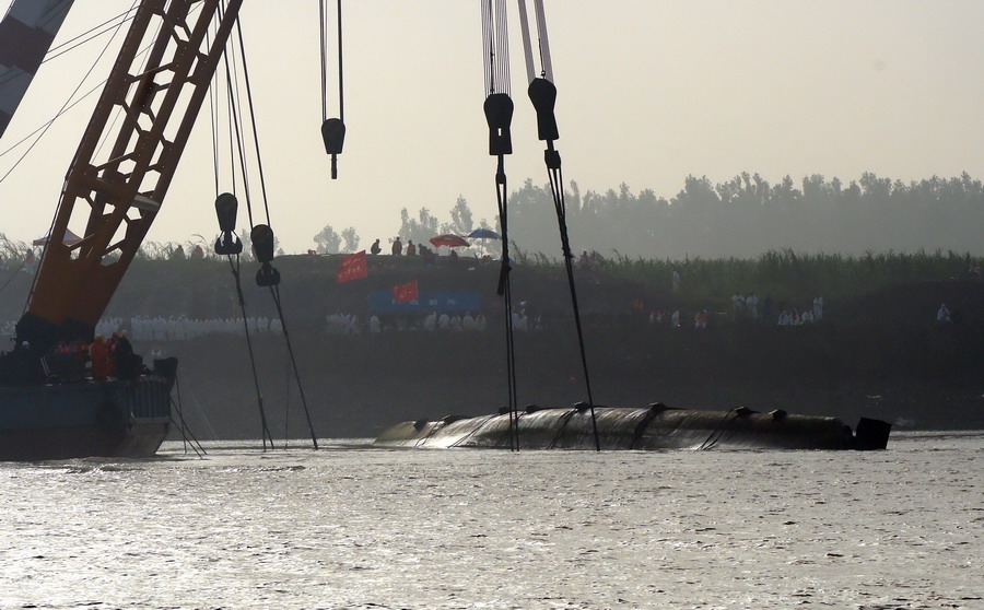 Rescue team turns capsized cruise ship 90 degrees onto its side. (Photo/ Xinhua)