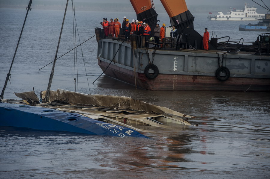 Rescue team turns capsized cruise ship 90 degrees onto its side. (Photo/ Xinhua)