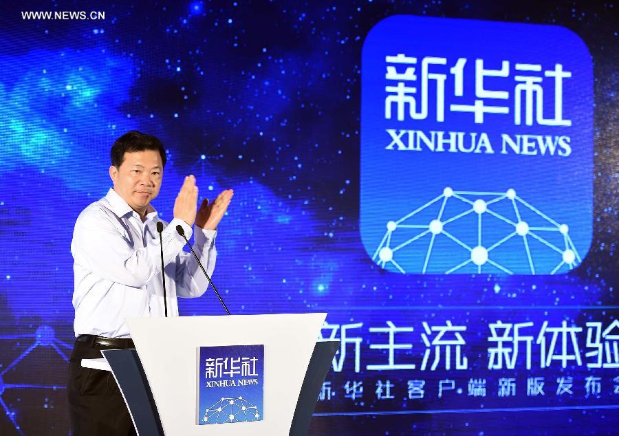 | Vice President of Xinhua News Agency Shen Haixiong presides over the launch ceremony of the new version of the mobile news app of Xinhua News Agency in Beijing, capital of China, June 8, 2015. Xinhua News Agency launched on Monday a new version of its Chinese news app, marking a key step in the news agency's efforts to advance the integration between traditional and new media. (Xinhua/Li He) |