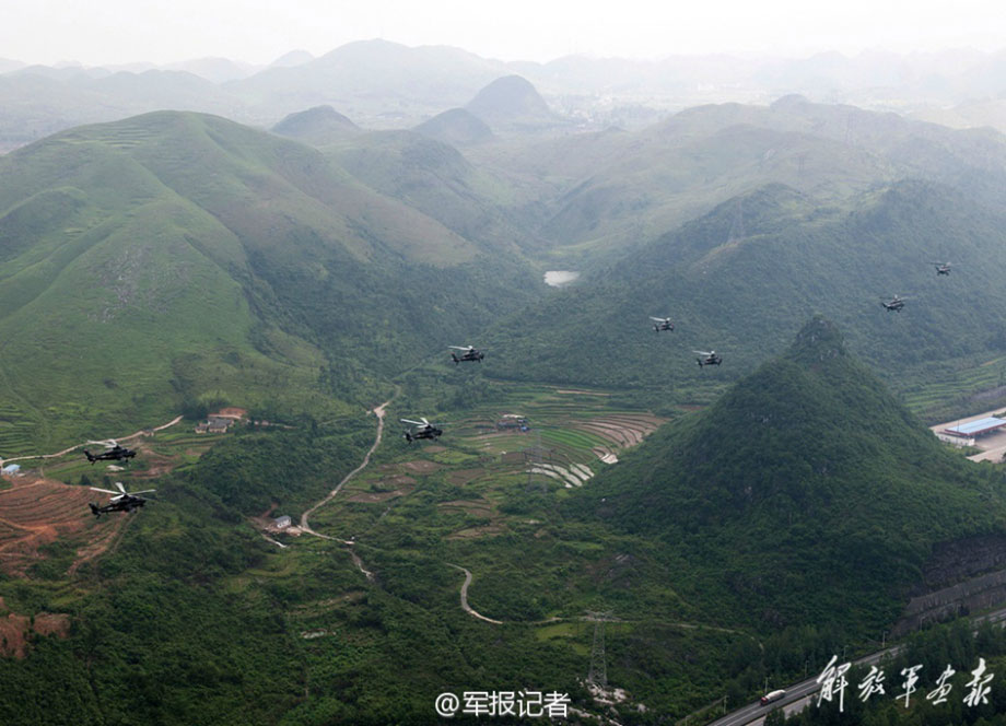 More than ten gunships and heavy-lift helicopters from the PLA 42nd Group Army head towards an airport on May 27, 2015. They arrived at the destination on May 31, 2015 after traveling more than 2,000 kilometers.(Photo/81.cn)