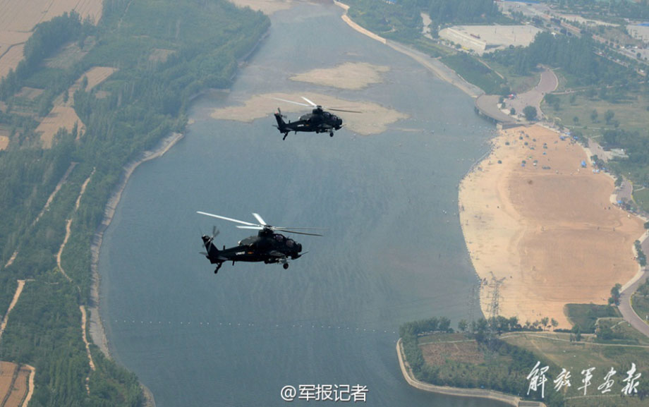 More than ten gunships and heavy-lift helicopters from the PLA 42nd Group Army head towards an airport on May 27, 2015. They arrived at the destination on May 31, 2015 after traveling more than 2,000 kilometers.(Photo/81.cn)