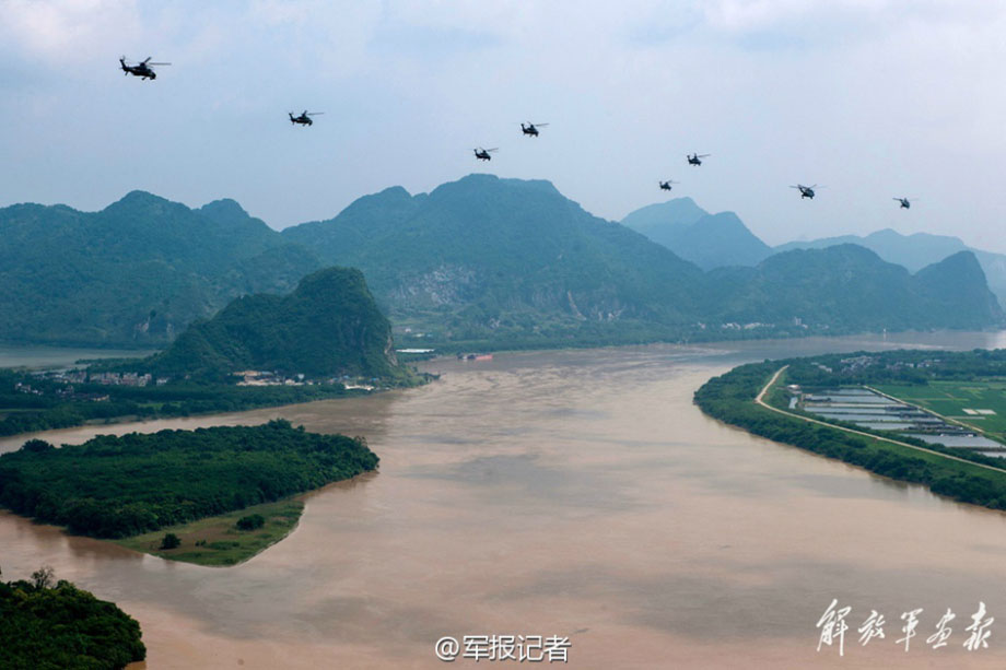 More than ten gunships and heavy-lift helicopters from the PLA 42nd Group Army head towards an airport on May 27, 2015. They arrived at the destination on May 31, 2015 after traveling more than 2,000 kilometers.(Photo/81.cn)