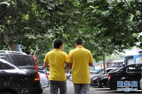 | Sun Jinwei and Wang Yuchao take a stroll at the Henan Provincial Tumor Hospital after undergoing physical examinations on June 4, 2015.(Photo/Xinhua) |
