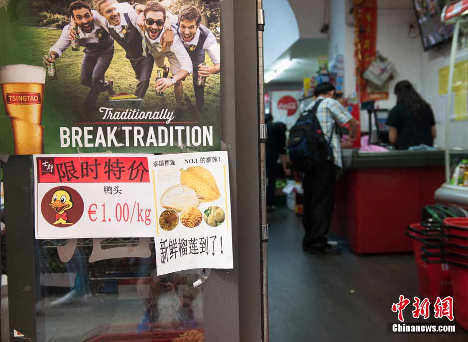 A supermarket in Via Paolo Sarpi, Milan, Italy, June 4, 2015. The Chinese advertisement on the door indicates the new arrival of snacks favored by Chinese people. (CNS/Li Qing)