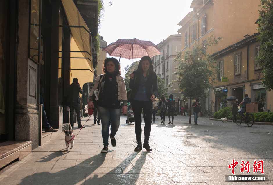 Local people run a dog in Via Paolo Sarpi, Milan, Italy, June 4, 2015. With the increase of Chinese shops and tourists, the street has become a scenic spot in Milan. (CNS/Li Qing)