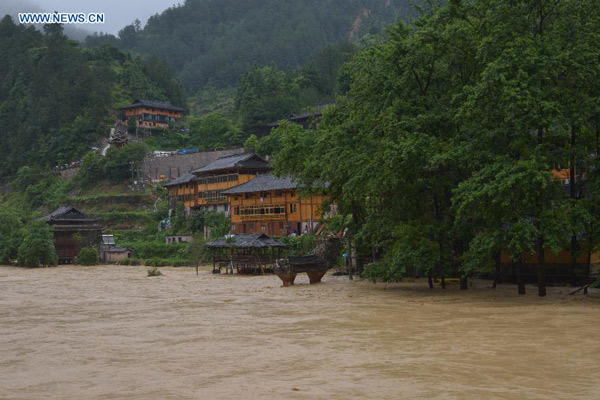 A vacation resort is submerged by water in Nanhua Village, southwest China's Guizhou Province, June 8, 2015. Heavy rains continued to batter southern regions of China on Monday. (Xinhua/Yuan Renlin)