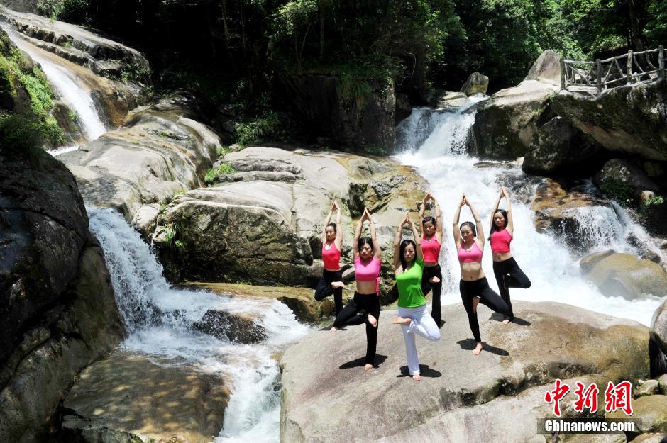 | Six Yoga fans perform Yoga around the Xiakou Waterfall in Dazhangshan Mountain of Wuyuan county, east China’s Jiangxi province recently, creating peaceful scenes of harmonious existence of nature and human. (Chinanews/Zhuo Zhongwei) |