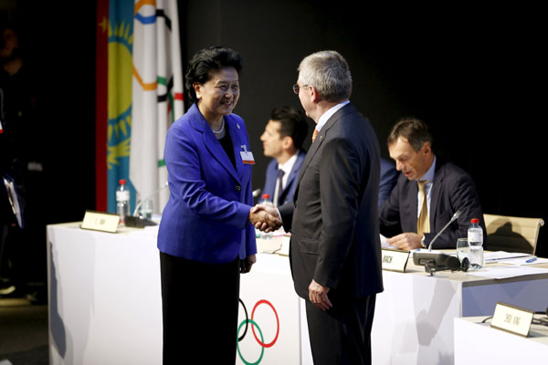International Olympic Committee (IOC) President Thomas Bach (R) welcomes China's vice premier Liu Yandong.[Photo/Agencies]